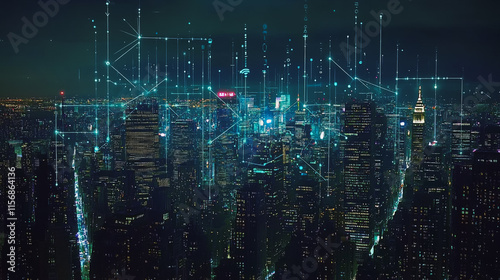 Smart digital Innovation city with connection network reciprocity over the cityscape. of future smart wireless city and social media networking systems that connects business people with in city