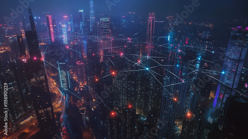 Smart digital Innovation city with connection network reciprocity over the cityscape. of future smart wireless city and social media networking systems that connects business people with in city
