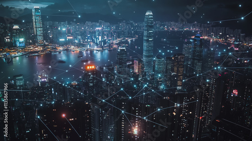 Smart digital Innovation city with connection network reciprocity over the cityscape. of future smart wireless digital city and social media networking systems that connects people with in city