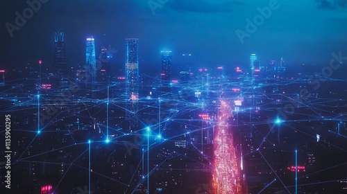 Smart digital Innovation city with connection network reciprocity over the cityscape. of future smart wireless digital city and social media networking systems that connects people with in city