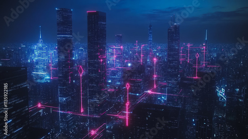 Smart digital Innovation city with connection network reciprocity over the cityscape. of future smart wireless digital city and social media networking systems that connects people with in city