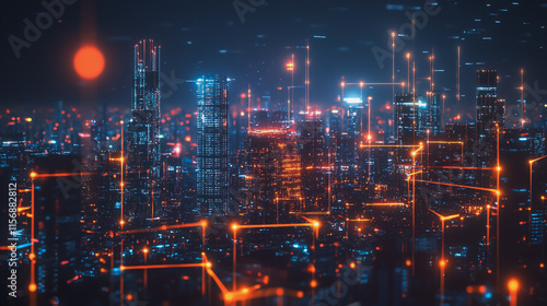 Smart digital Innovation city with connection network reciprocity over the cityscape. of future smart wireless digital city and social media networking systems that connects people with in city