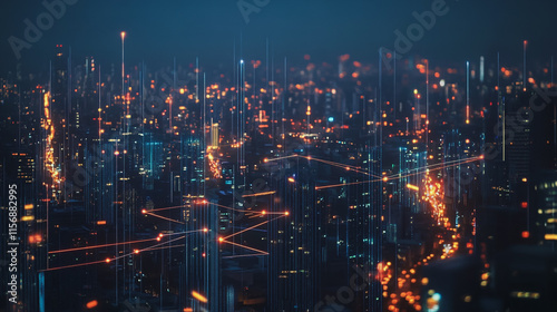 Smart digital Innovation city with connection network reciprocity over the cityscape. of future smart wireless digital city and social media networking systems that connects people with in city