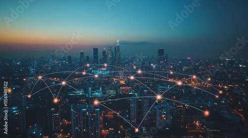 Smart digital Innovation city with connection network reciprocity over the cityscape. of future smart wireless digital city and social media networking systems that connects people with in city