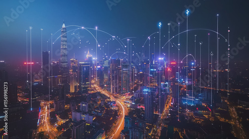 Smart digital Innovation city with connection network reciprocity over the cityscape. of future smart wireless digital city and social media networking systems that connects people with in city