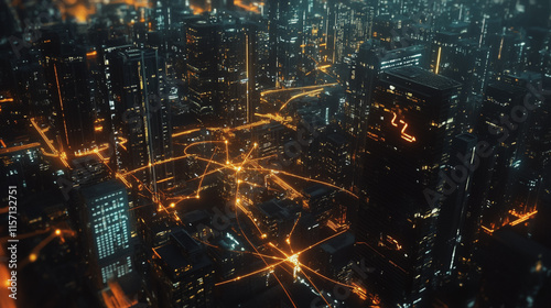 Smart digital Innovation city with connection network reciprocity over the cityscape. of future smart wireless digital city and social media networking systems that connects people with in city