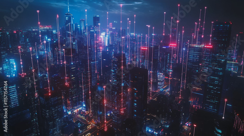 Smart digital Innovation city with connection network reciprocity over the cityscape. of future smart wireless digital city and social media networking systems that connects people with in city