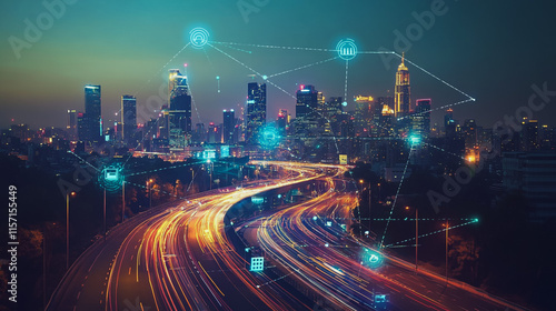 Smart digital Innovation city with connection network reciprocity over the cityscape. of future smart wireless digital city and social media networking systems that connects people with in city