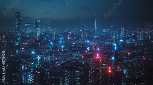 Smart digital Innovation city with connection network reciprocity over the cityscape. of future smart wireless digital city and social media networking systems that connects people with in city