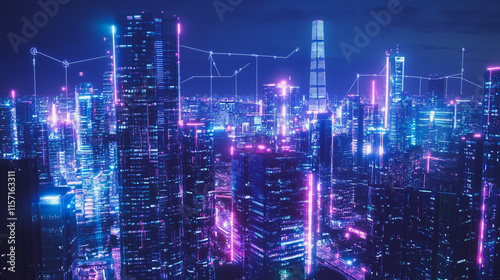 Smart digital Innovation city with connection network reciprocity over the cityscape. of future smart wireless digital city and social media networking systems that connects people with in city