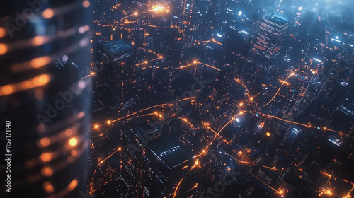 Smart digital Innovation city with connection network reciprocity over the cityscape. of future smart wireless digital city and social media networking systems that connects people with in city