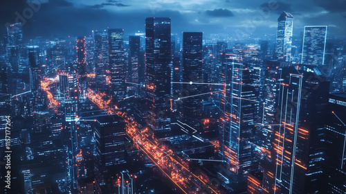 Smart digital Innovation city with connection network reciprocity over the cityscape. of future smart wireless digital city and social media networking systems that connects people with in city