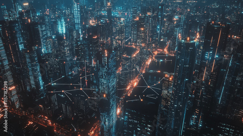 Smart digital Innovation city with connection network reciprocity over the cityscape. of future smart wireless digital city and social media networking systems that connects people with in city