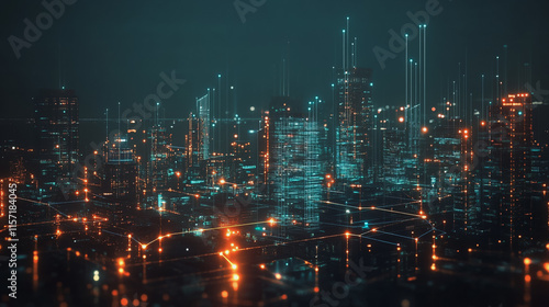 Smart digital Innovation city with connection network reciprocity over the cityscape. of future smart wireless digital city and social media networking systems that connects people with in city
