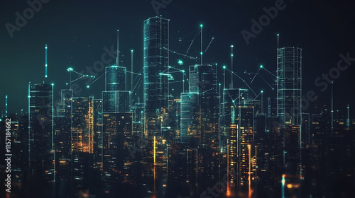 Smart digital Innovation city with connection network reciprocity over the cityscape. of future smart wireless digital city and social media networking systems that connects people with in city