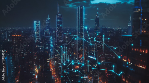 Smart digital Innovation city with connection network reciprocity over the cityscape. of future smart wireless digital city and social media networking systems that connects people with in city