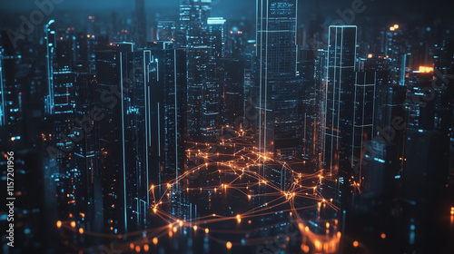 Smart digital Innovation city with connection network reciprocity over the cityscape. of future smart wireless digital city and social media networking systems that connects people with in city
