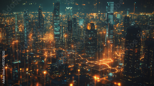 Smart digital Innovation city with connection network reciprocity over the cityscape. of future smart wireless digital city and social media networking systems that connects people with in city