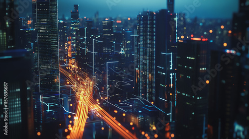 Smart digital Innovation city with connection network reciprocity over the cityscape. of future smart wireless digital city and social media networking systems that connects people with in city