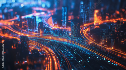 Smart digital Innovation city with connection network reciprocity over the cityscape. of future smart wireless digital city and social media networking systems that connects people with in city