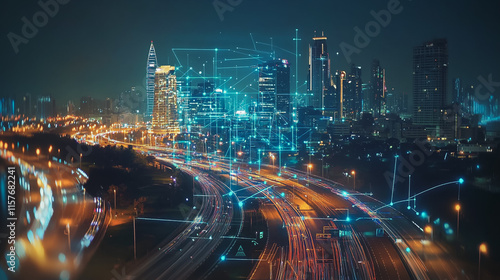 Smart digital Innovation city with connection network reciprocity over the cityscape. of future smart wireless digital city and social media networking systems that connects people with in city