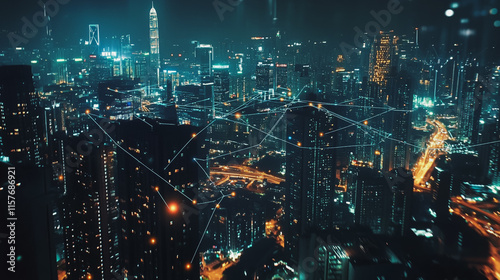 Smart digital Innovation city with connection network reciprocity over the cityscape. of future smart wireless digital city and social media networking systems that connects people with in city