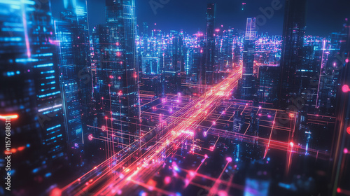 Smart digital Innovation city with connection network reciprocity over the cityscape. of future smart wireless digital city and social media networking systems that connects people with in city