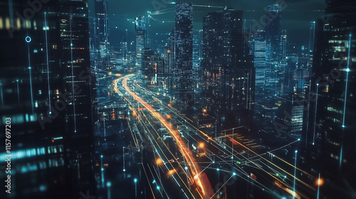 Smart digital Innovation city with connection network reciprocity over the cityscape. of future smart wireless digital city and social media networking systems that connects people with in city