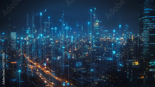 Smart digital Innovation city with connection network reciprocity over the cityscape. of future smart wireless digital city and social media networking systems that connects people with in city