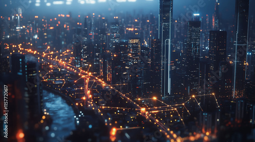 Smart digital Innovation city with connection network reciprocity over the cityscape. of future smart wireless digital city and social media networking systems that connects people with in city