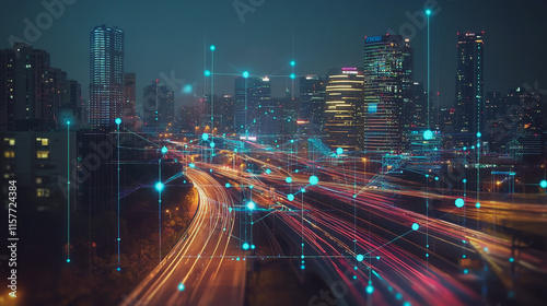 Smart digital Innovation city with connection network reciprocity over the cityscape. of future smart wireless digital city and social media networking systems that connects people with in city
