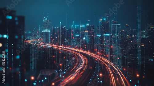 Smart digital Innovation city with connection network reciprocity over the cityscape. of future smart wireless digital city and social media networking systems that connects people with in city