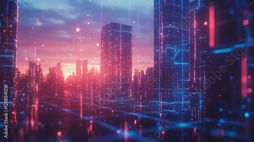 Smart digital Innovation city with connection network reciprocity over the cityscape. of future smart wireless digital city and social media networking systems that connects people with in city