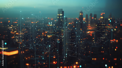 Smart digital Innovation city with connection network reciprocity over the twilight cityscape. of future smart wireless digital city and social media networking systems that connects people with city