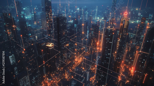 Smart digital Innovation city with connection network reciprocity over the twilight cityscape. of future smart wireless digital city and social media networking systems that connects people with city