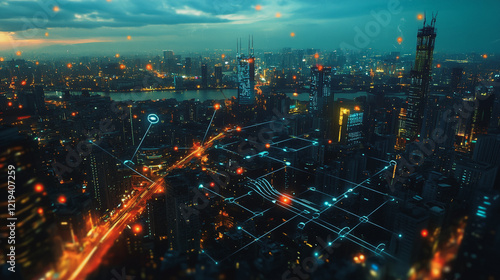 Smart digital Innovation city with connection network reciprocity over the twilight cityscape. of future smart wireless digital city and social media networking systems that connects people with city