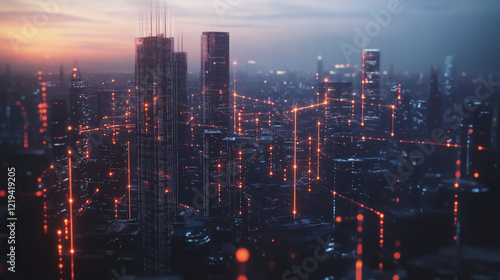 Smart digital Innovation city with connection network reciprocity over the twilight cityscape. of future smart wireless digital city and social media networking systems that connects people with city