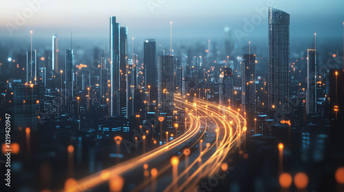 Smart digital Innovation city with connection network reciprocity over the twilight cityscape. of future smart wireless digital city and social media networking systems that connects people with city