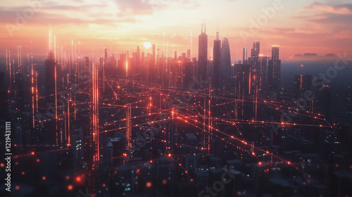 Smart digital Innovation city with connection network reciprocity over the twilight cityscape. of future smart wireless digital city and social media networking systems that connects people with city