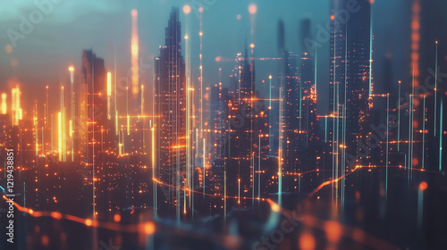 Smart digital Innovation city with connection network reciprocity over the twilight cityscape. of future smart wireless digital city and social media networking systems that connects people with city