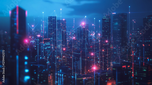 Smart digital Innovation city with connection network reciprocity over the twilight cityscape. of future smart wireless digital city and social media networking systems that connects people with city