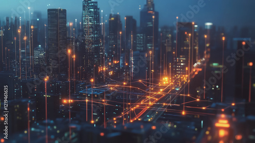 Smart digital Innovation city with connection network reciprocity over the twilight cityscape. of future smart wireless digital city and social media networking systems that connects people with city