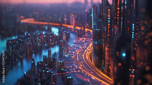 Smart digital Innovation city with connection network reciprocity over the twilight cityscape. of future smart wireless digital city and social media networking systems that connects people with city