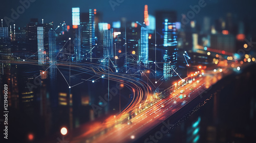 Smart digital Innovation city with connection network reciprocity over the twilight cityscape. of future smart wireless digital city and social media networking systems that connects people with city