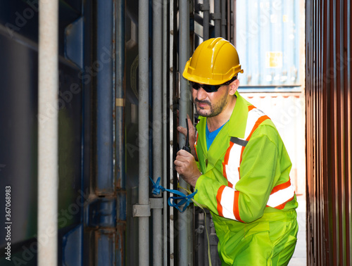 Smart engineer man wearing industrial work wear coverall with reflective trim and protective helmet doing stock check and close the heavy container door in container yard in warehouse background.