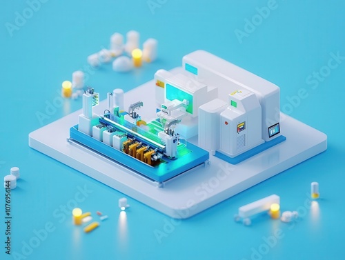 Smart factory with modular machines working in harmony, isometric visualization of efficiency