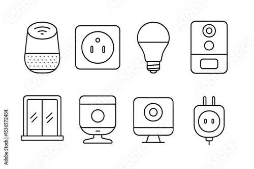 Smart Home Icons. Line style icons of smart home devices: smart speaker, thermostat, smart bulb, doorbell camera. home hub, motion