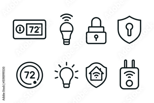 Smart home icons representing thermostat, light, lock, security, and automation devices