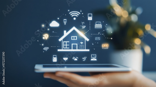 Smart home interface on tablet with various connected devices displayed, showcasing modern technology and convenience