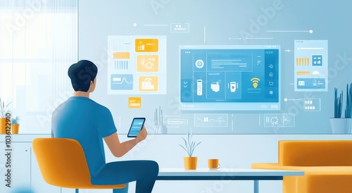 Smart home interior with technology enthusiast controlling connected devices using tablet in modern living space
